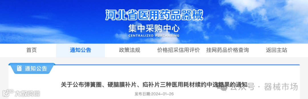 2024年1月26日,河北省医用药品器械集中采购中心公布了弹簧圈、硬脑膜补片、疝补片三种医用耗材的续约中选结果。美敦力、强生、史赛克、微创医疗等知名医疗器械公司入选。