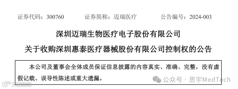 如果全部收购计划顺利进行,迈瑞医疗将通过其子公司深圳迈瑞科技控股有限责任公司(简称“深迈控”)及其一致行动人珠海彤昇共同持有惠泰医疗24.61%的股份,从而成为惠泰医疗的第一大股东和控股股东。