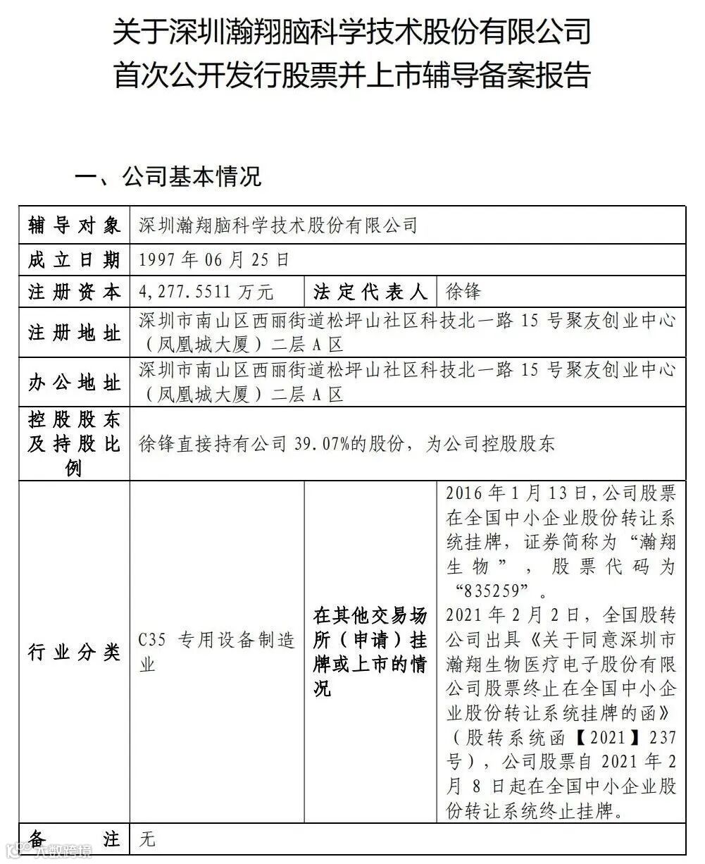 近期,证监会官网披露,深圳瀚翔脑科学技术股份有限公司(以下简称:“瀚翔脑科学”)上市辅导备案,辅导机构为国信证券股份有限公司,派出机构为深圳证监局。