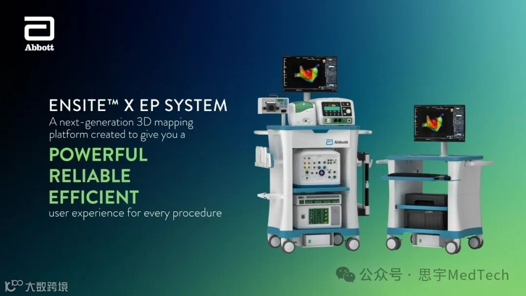 雅培最先进的三维标测系统为EnSite™ X EP。这款标测系统于2020年11月获得了CE认证,2022年1月获得了FDA的批准。该系统是首个拥有两种心脏可视化方法的标测系统,结合了单级测量和双极测量,单级测量在方向和速度上有优势,双极测量能够提供局部信号测量来定位目标部位。