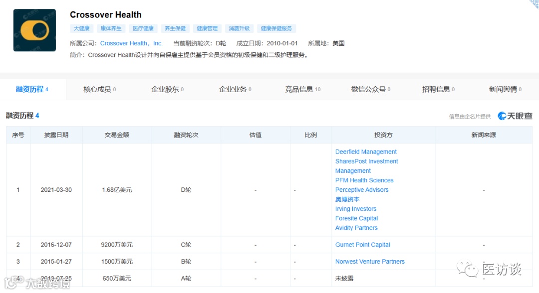 Crossover Health是一家为雇主提供全面健康服务的公司。2021年3月30日该公司获得了由Deerfield Management Company领投的1.68亿美元(11.5亿人民币)的D轮融资,其他投资者包括Perceptive Advisors、OrbiMed Advisors、Foresite Capital、Avidity Partners、SharesPost100 Fund、Irving Investors和PFM Health Sciences。Crossover将利用这笔融资,继续在全美范围内扩展用户和付款人互联医疗体系。截至目前,Crossover Health融资总额已达到2.815亿美元(19亿人民币)