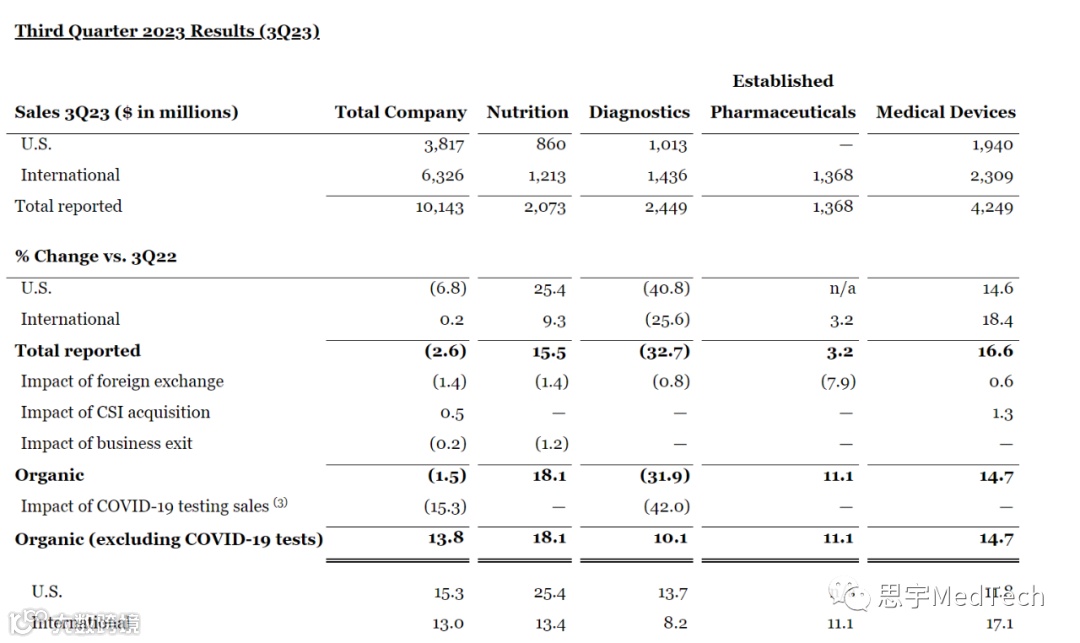正如预期的那样,第三季度的诊断业务销售增长受到了 COVID-19 测试相关销售同比下降的负面影响。2023 年第三季度全球 COVID-19 检测销售额为 3.05 亿美元,而上一年第三季度为 16.71 亿美元。不包括与 COVID-19 检测相关的销售额,全球诊断销售额按报告增长 8.8%,按有机增长 10.1%。