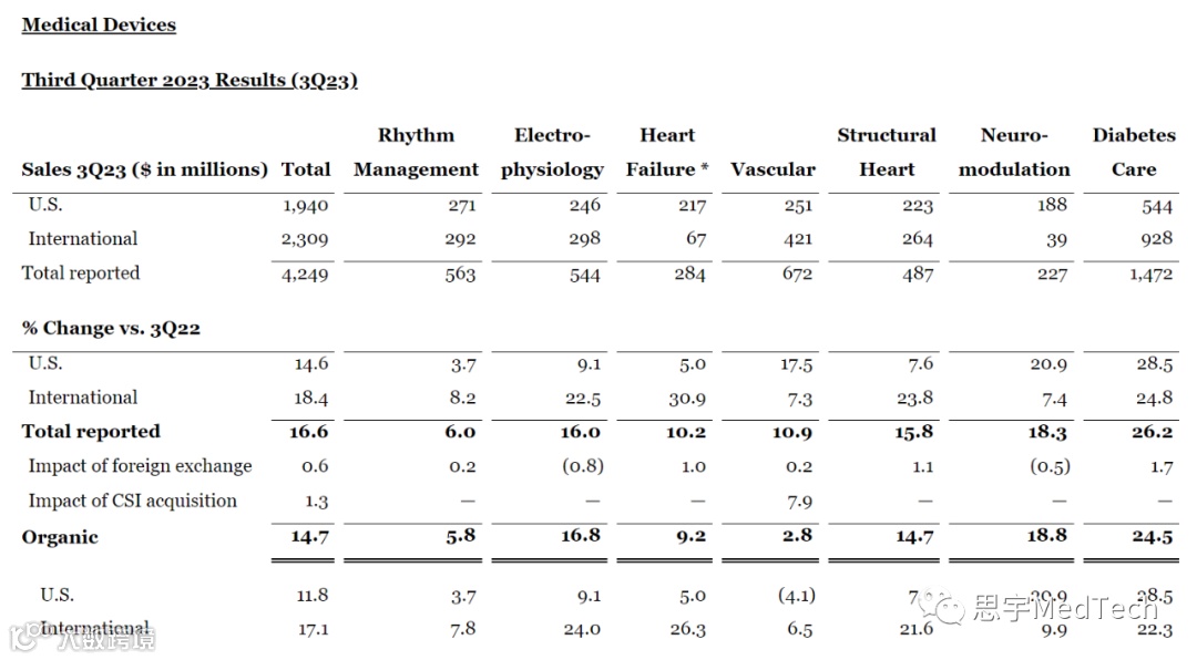 第三季度全球医疗器械销售额按报告增长 16.6%,有机增长 14.7%。销售额增长主要由糖尿病护理、电生理、结构性心脏和神经调节领域两位数的有机增长带动。最近推出的一些产品和新适应症为强劲的业绩做出了贡献,包括 Amplatzer® Amulet®、Navitor®、TriClip® 和 AVEIR。