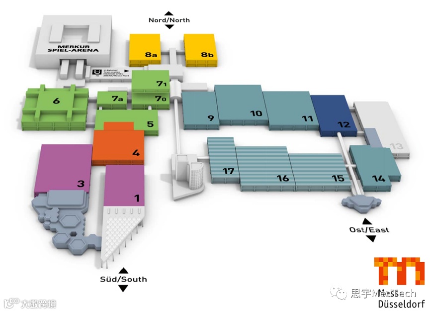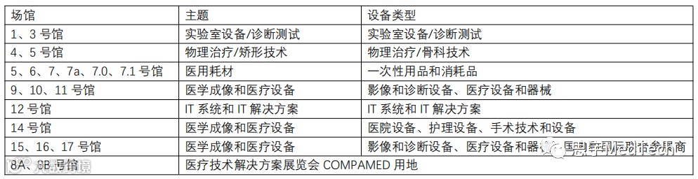 2023年的Medica展会按照以下五大主题进行分类:医学成像和医疗设备(Med Tech & Devices)、实验室设备/诊断测试(Lab & Diagnosis)、物理治疗/矫形技术(Physio Tech)、IT系统和IT解决方案(Digital Health)和医用耗材(Disposables)。场馆设置如下图: