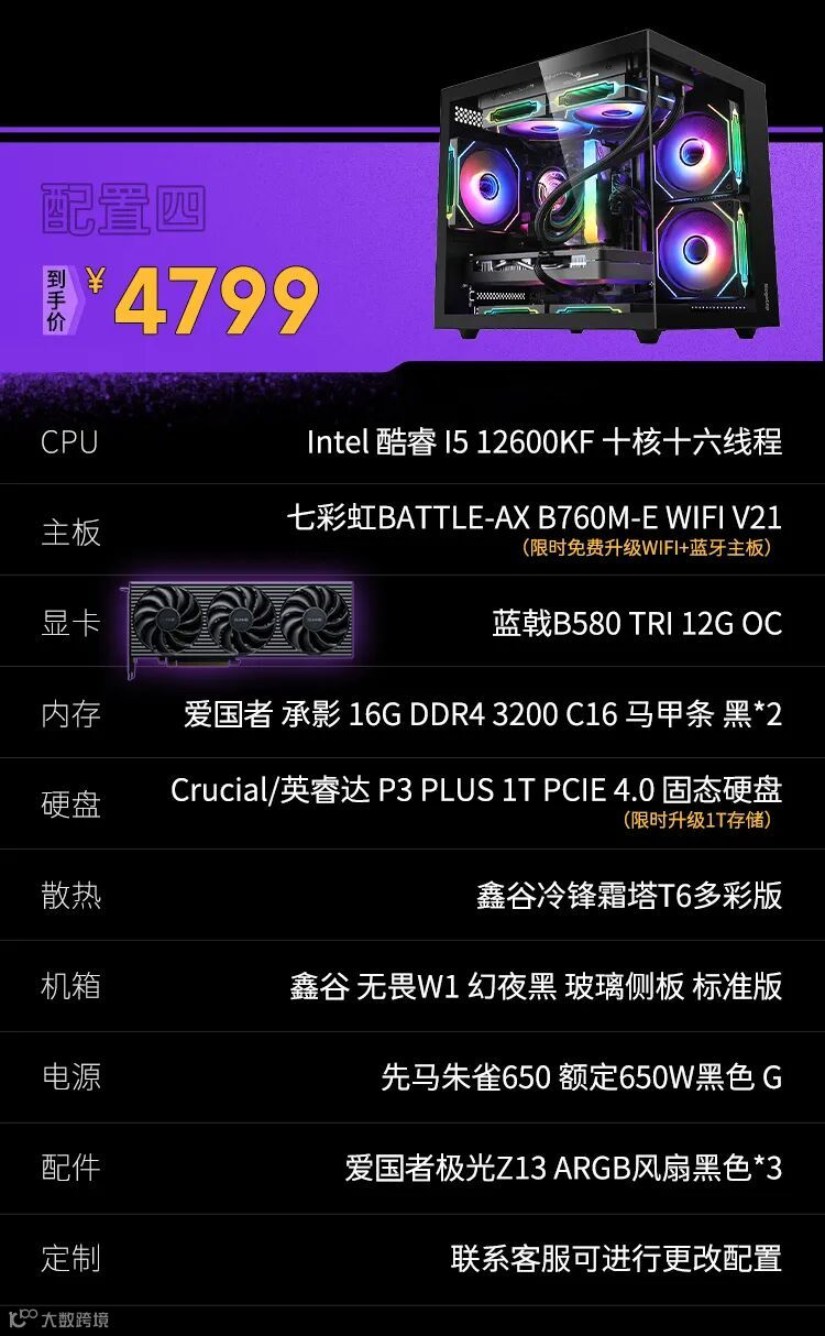 如果追求更高的游戏性能,这款定价为4799元的电脑或许是理想选择。i5 12600KF搭配和蓝戟B580 TRI 12G显卡,能够畅玩《黑神话:悟空》、《F1 2024》以及《真·三国无双 起源》等游戏。ARGB灯光效果加侧透面板设计,赋予了整机更加个性化的外观风格。