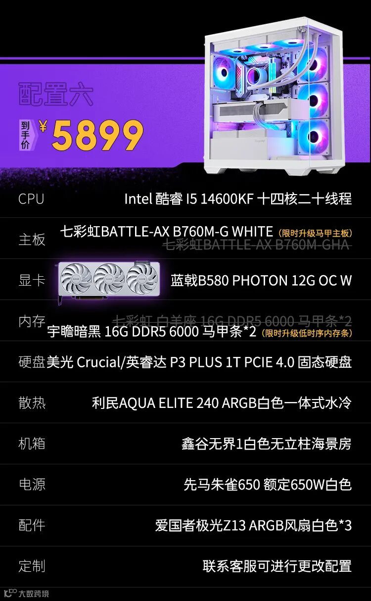 如果对于白色海景房有特别执念,可以看看下面这套5899元的白色海景房装机方案。i5 14600KF搭配和蓝戟B580 PHOTON 12G显卡,无论是玩游戏还是进行视频剪辑,表现都相当出色,包括近期爆火的DeepSeek也能轻松驾驭。这套配置使用了利民一体式水冷,即使在高负荷运行状态下,也能确保温度保持在适宜范围。