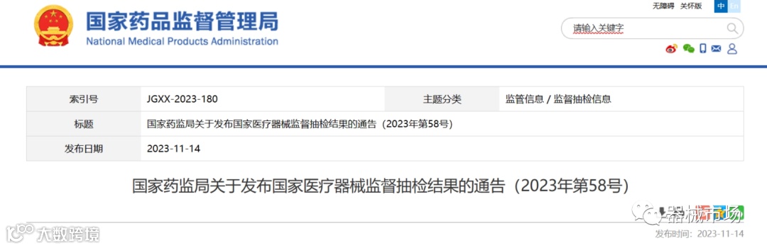 国家药监局关于发布国家医疗器械监督抽检结果的通告(2023年第58号)》,