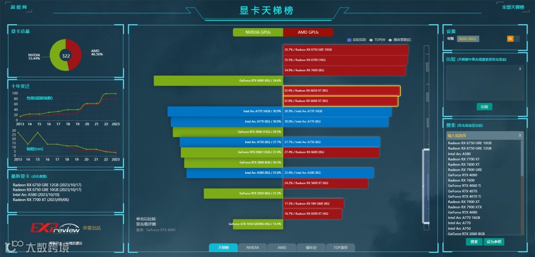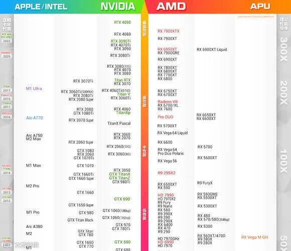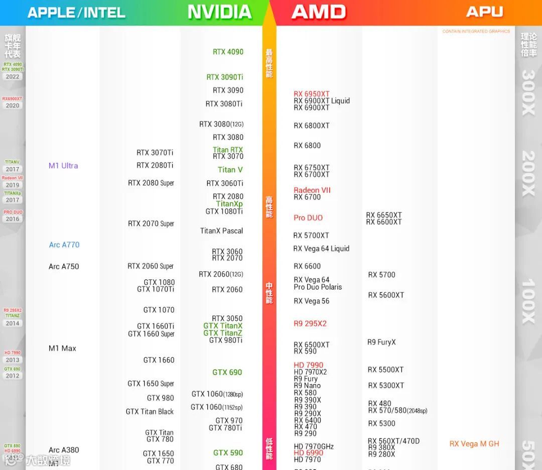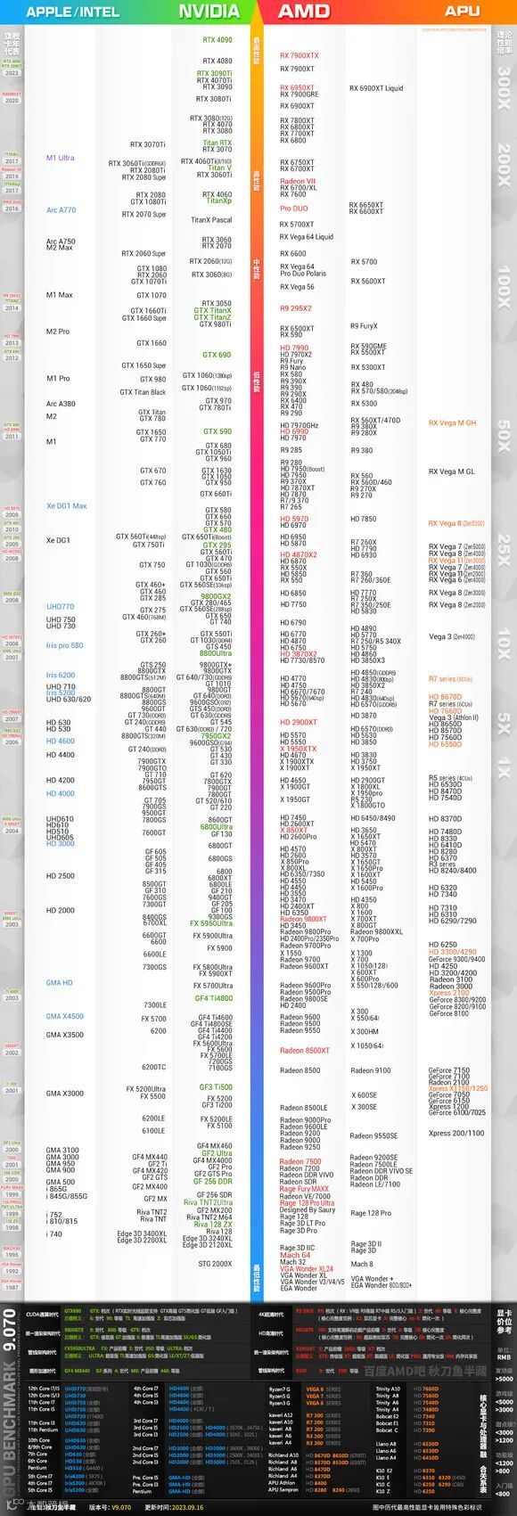 来自AMD贴吧大神秋刀鱼半藏的显卡天梯图,数据可能更接近用户体验层面。在11月19日的最新版本中: