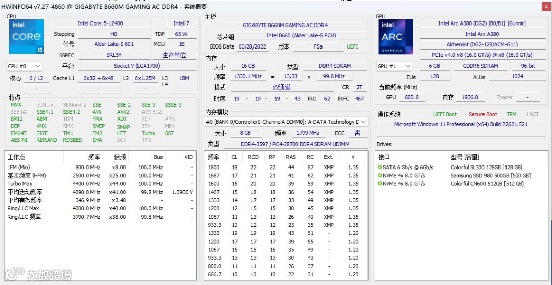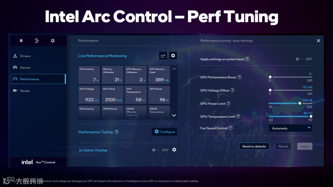 每个厂家的显卡都有自己的控制面板软件,Intel Arc Control便是英特尔显卡自家的GPU检测及调节软件。在Intel Arc Control不仅可以看到显卡的各方面数据,也能看到其他硬件的运行数据,甚至可以在控制面板内调节功耗和频率。而Intel Arc Control也方便随时调用,按下“Alt+i”即可快速打开,按“Alt+o”可开启性能监测的悬浮小窗。