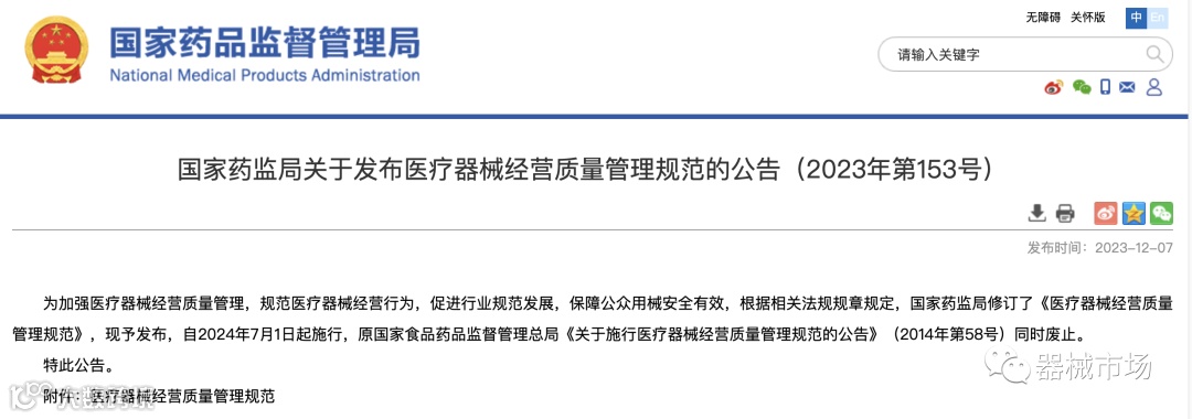 《医疗器械经营质量管理规范》自2014年发布实施以来,发挥了积极作用。2023年12月4日,国家药监局修订了《医疗器械经营质量管理规范》(以下简称《规范》),明年7月1日起施行。