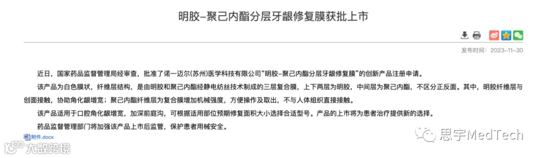 2023年11月30日,国家药监局更新了诺一迈尔(苏州)医学科技有限公司(以下简称:诺一迈尔)的“明胶-聚己内酯分层牙龈修复膜”产品获批消息,注册证编号为“国械注准20233171776”。