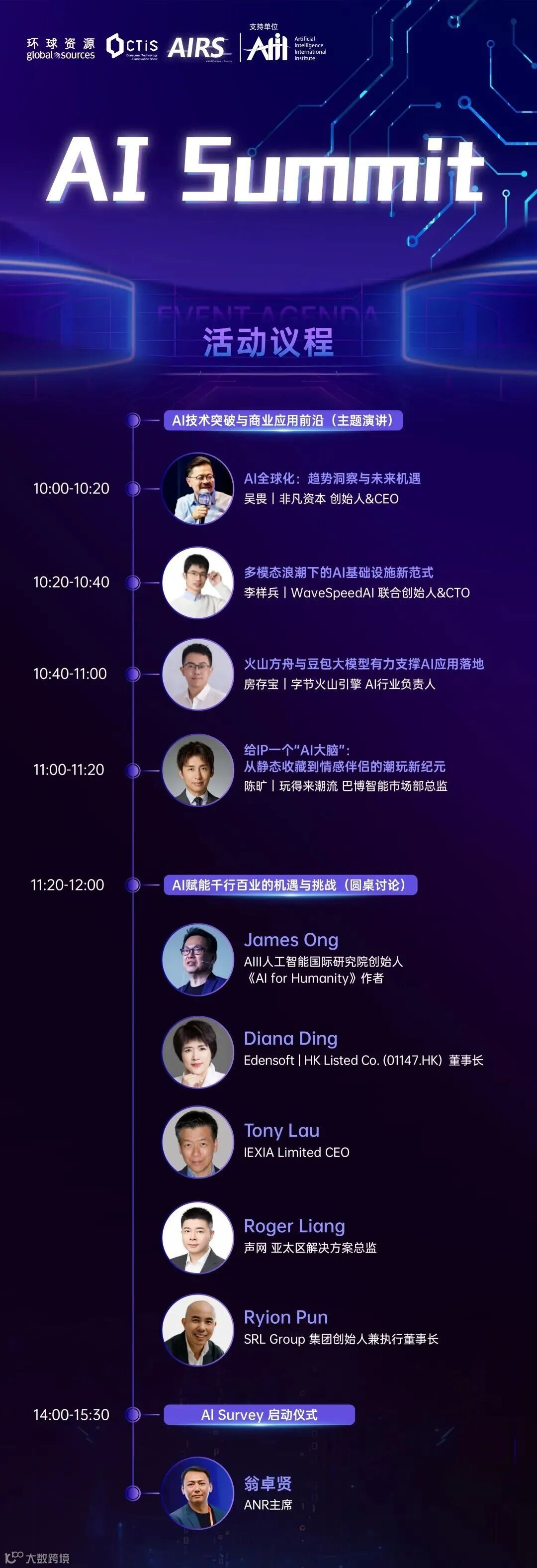 AI Summit 圆桌论坛将以 “AI Empowering Industries” 为主题,邀请多位行业领袖展开深度对话。探讨人工智能如何驱动产业变革。嘉宾将分享产业机遇与落地案例,分析AI转型中的伦理挑战与社会影响,并展望全球市场机遇。