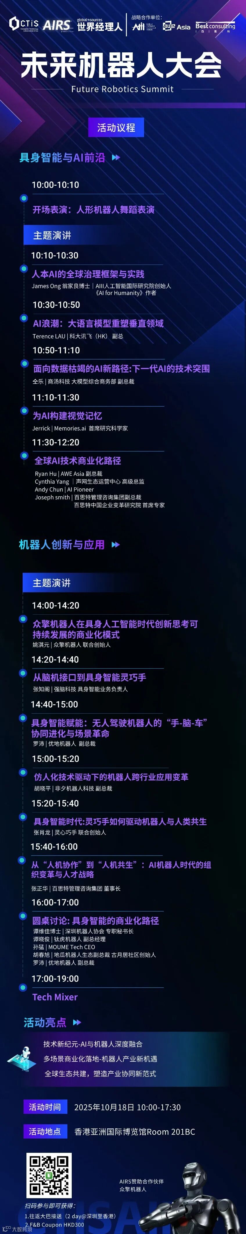 AI与机器人产业峰会(AIRS),将于2025年10月18日—21日在香港亚洲国际博览馆举行,与消费者科技及创新展(CTIS) 及环球资源移动电子展(ME) 同期举办。