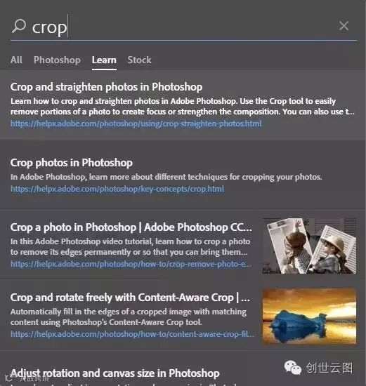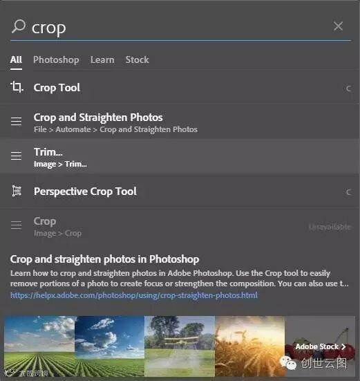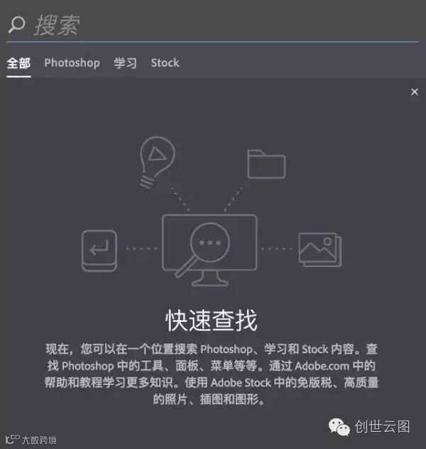 快速搜索可以让我们在 PS 中快速查找工具、面板、菜单、Adobe Stock 资源模板、教程等,工作更加高效快捷。