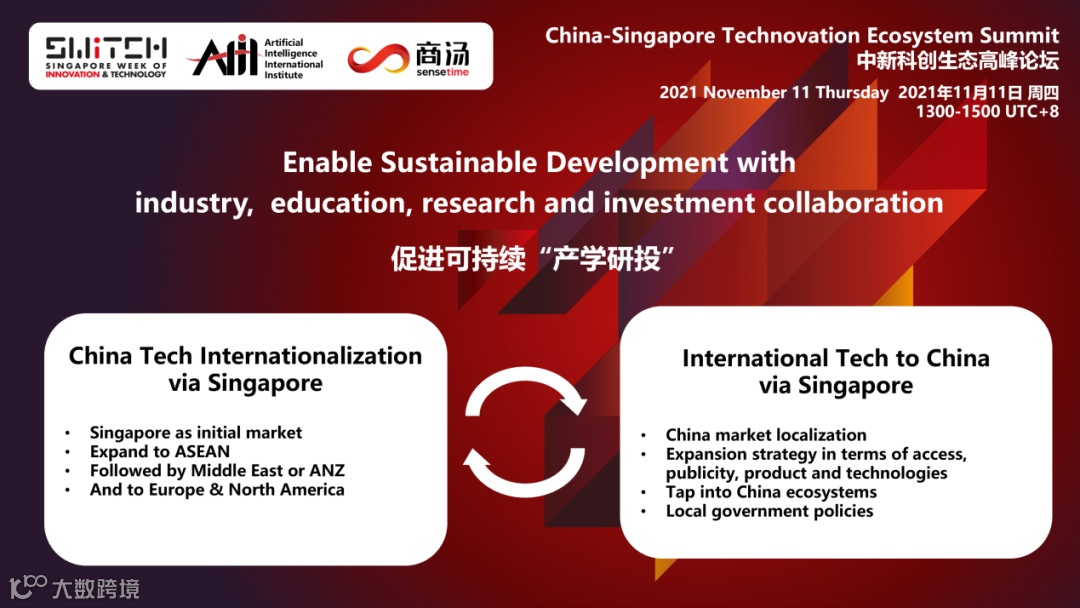 在SWITCH 新加坡科技创新周(11月8日-12日)期间,SWITCH与AIII人工智能国际研究研究共同举办了一场聚焦中新科技生态合作的专题科创高峰会议,涵盖产学研投。目的是将来自两个生态的产学研投机构聚集在一起,进行更多的分享和对话,以促进可持续的发展和合作。