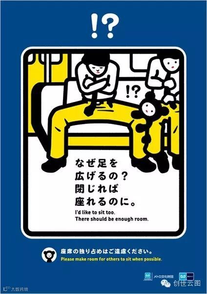 前阵子纽约大都会运输局(MTA)为了改善乘客的乘车礼仪,开始在地铁上进行倡导,希望减少开腿、少吃东西及鼓励让座。不过令人讶异的是,类似的“禁止开腿”文宣,也出现在以礼仪著称的日本。下列即为不同时期,日本倡导的相关广告: