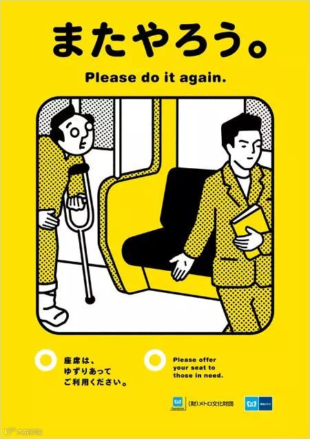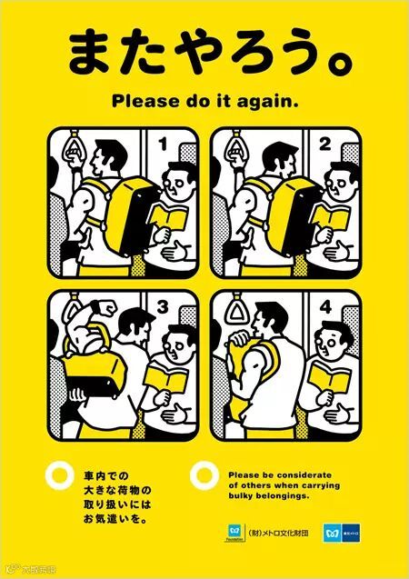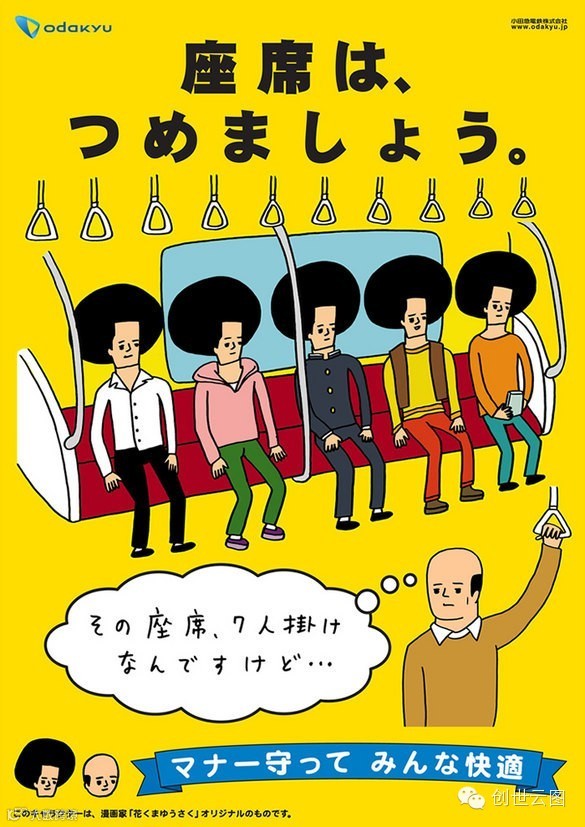 △ 2013 年,东京的小田急线则请插画家 Yusaku Hanakuma 创作图像,推广地铁上该有的乘车礼仪。那群蓬蓬头兄弟你们是几个意思啊?