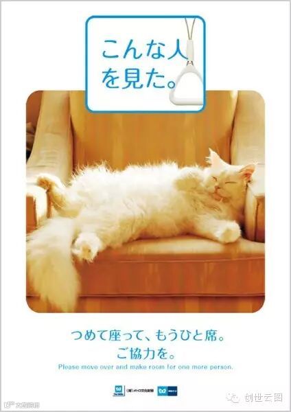 △ 2011 年东京地铁一系列的宣传广告使用令人喜爱的猫与狗当作主角,提醒乘客人不是猫猫狗狗。广告标语写着:“我见过有人这样坐着。”