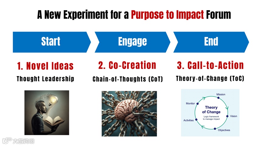 To curate an end-to-end whole day forum to serve the needs of Purpose to Impact based on the 3-steps process and experience from Novel ideas via Co-creation towards Call-to-Action.