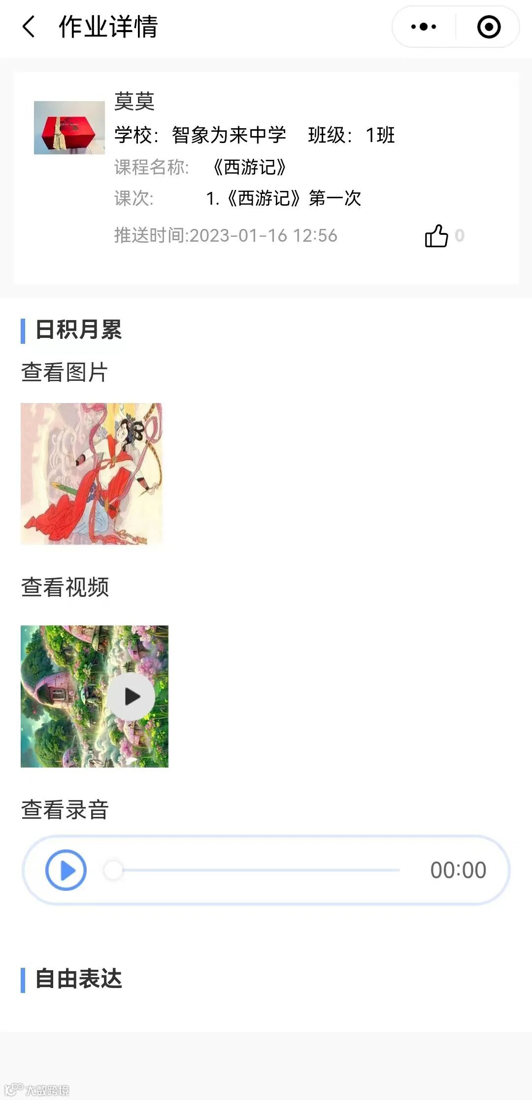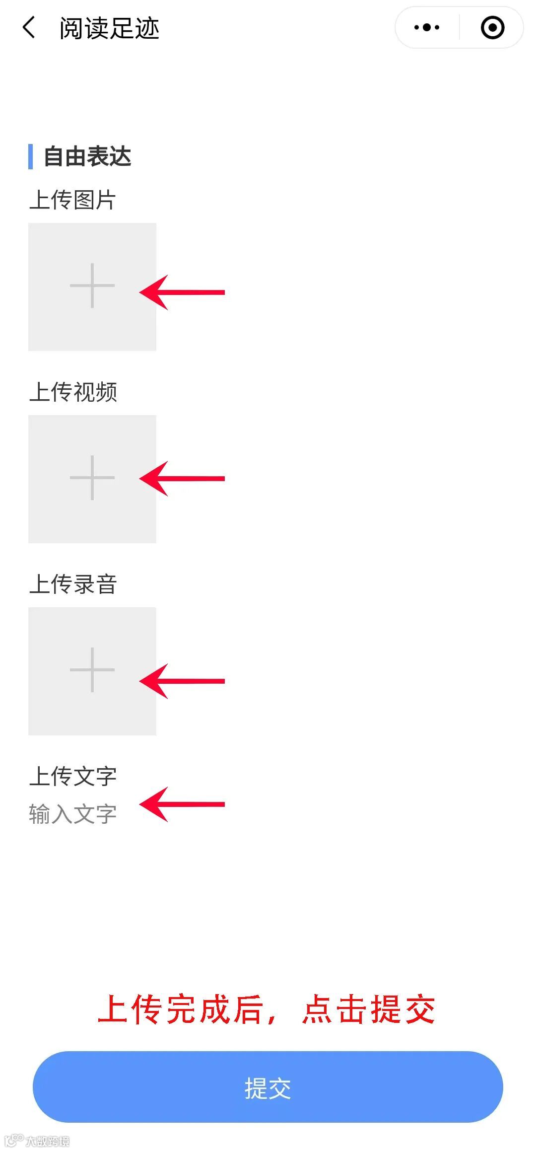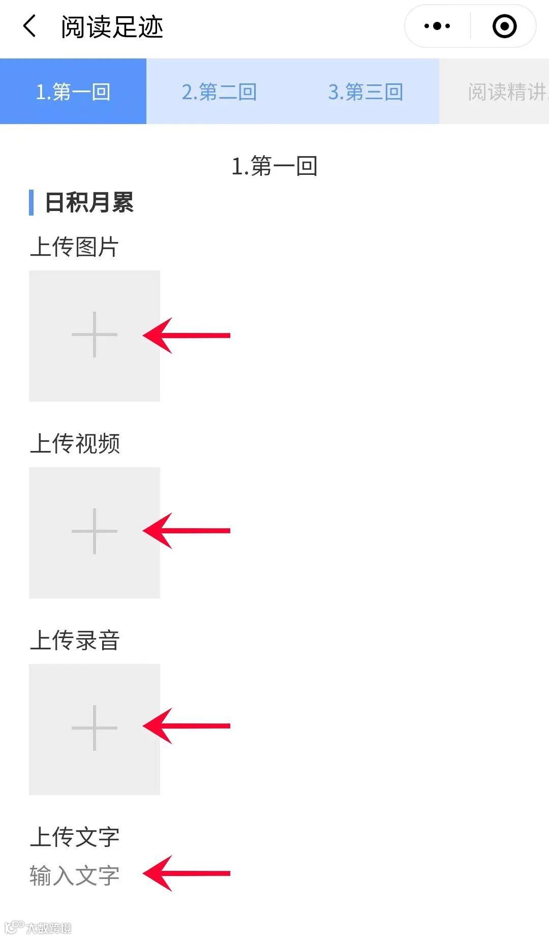 之后再进入“阅读足迹”板块,里面可通过图片,视频,录音,文字的形式上传“日积月累”和“自由表达”的内容。