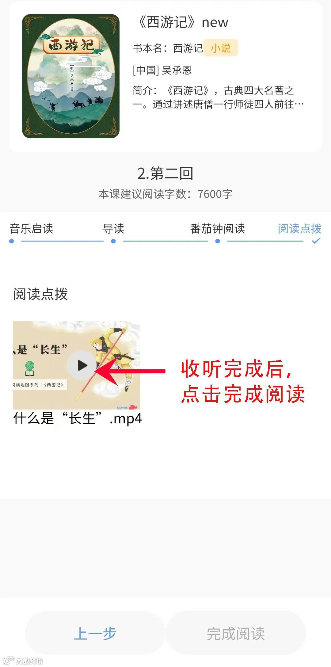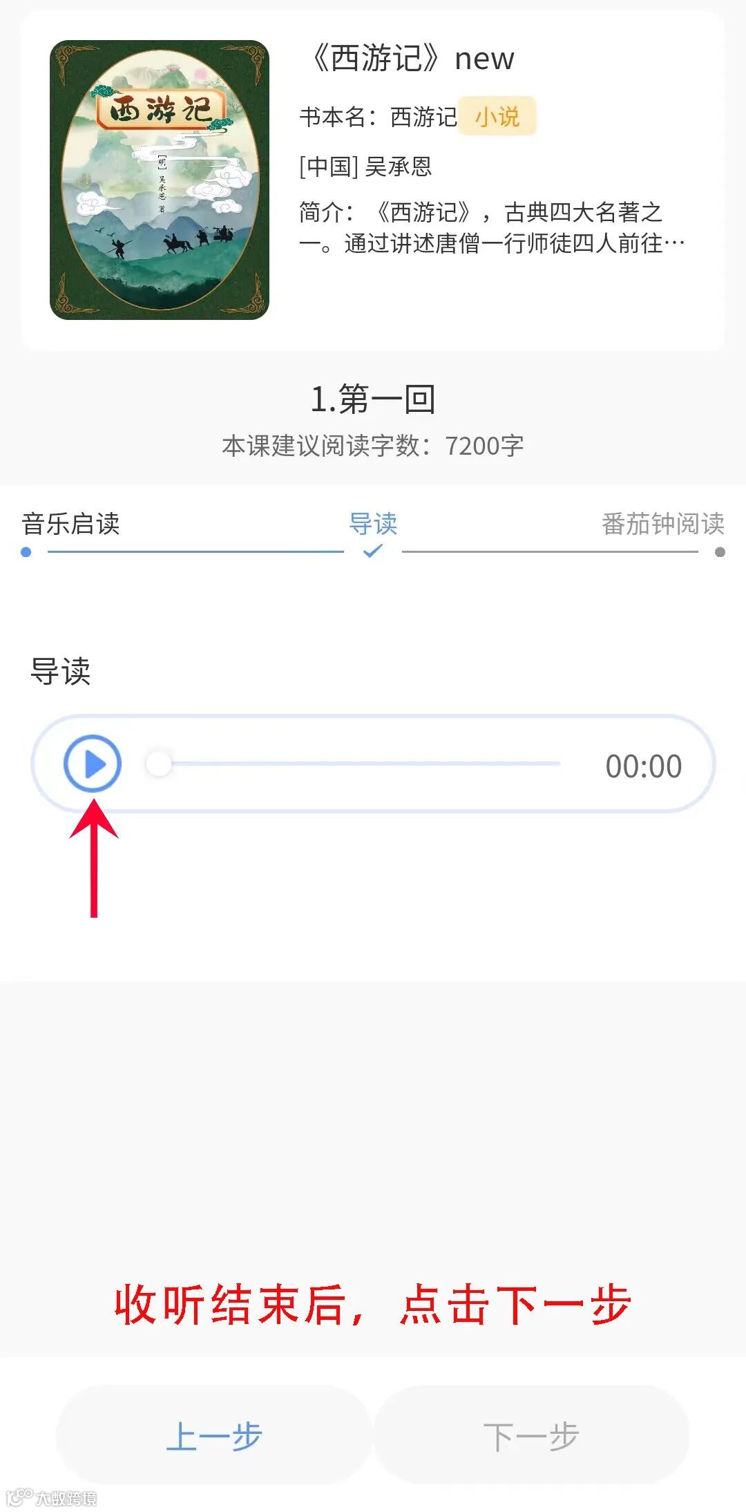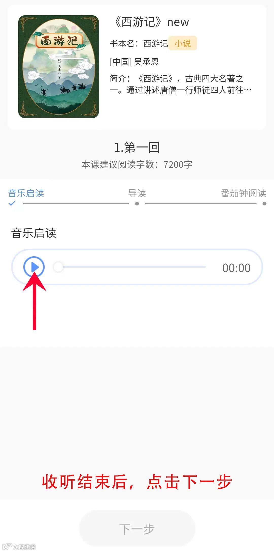 进入章节后,首先收听音乐启读,之后一步步往下进行,完成章节阅读。