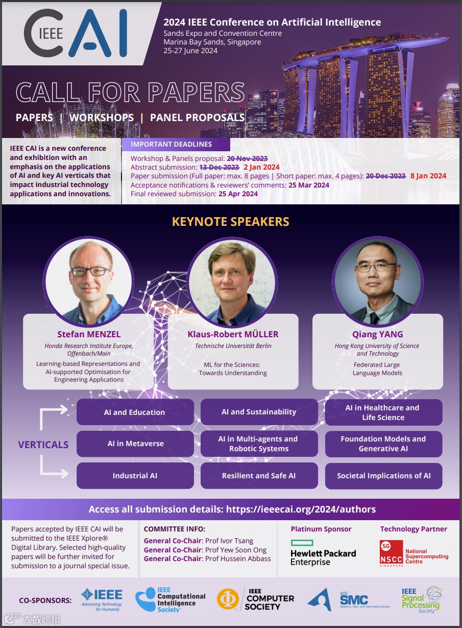 第二届IEEE CAI将于2024年6月25日至27日在新加坡滨海湾金沙举行。欢迎您参加2024 IEEE CAI !