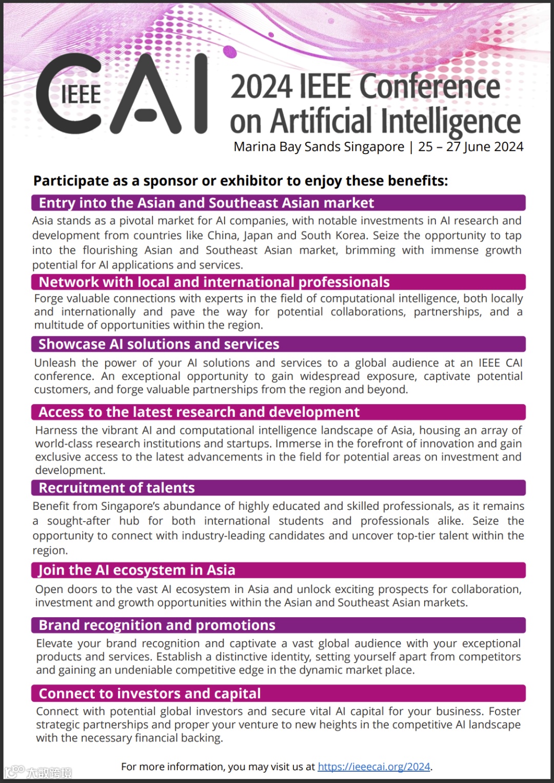 总体而言,在IEEE CAI 2024新加坡会议上赞助和参展可以为任何领先和新兴的人工智能公司提供许多好处,包括进入亚洲和东南亚市场,交流机会,展示人工智能解决方案和服务,获得最新的研究和开发,加入亚洲的人工智能生态系统,招聘人才,品牌知名度和推广,以及会见和获得投资者和资本。