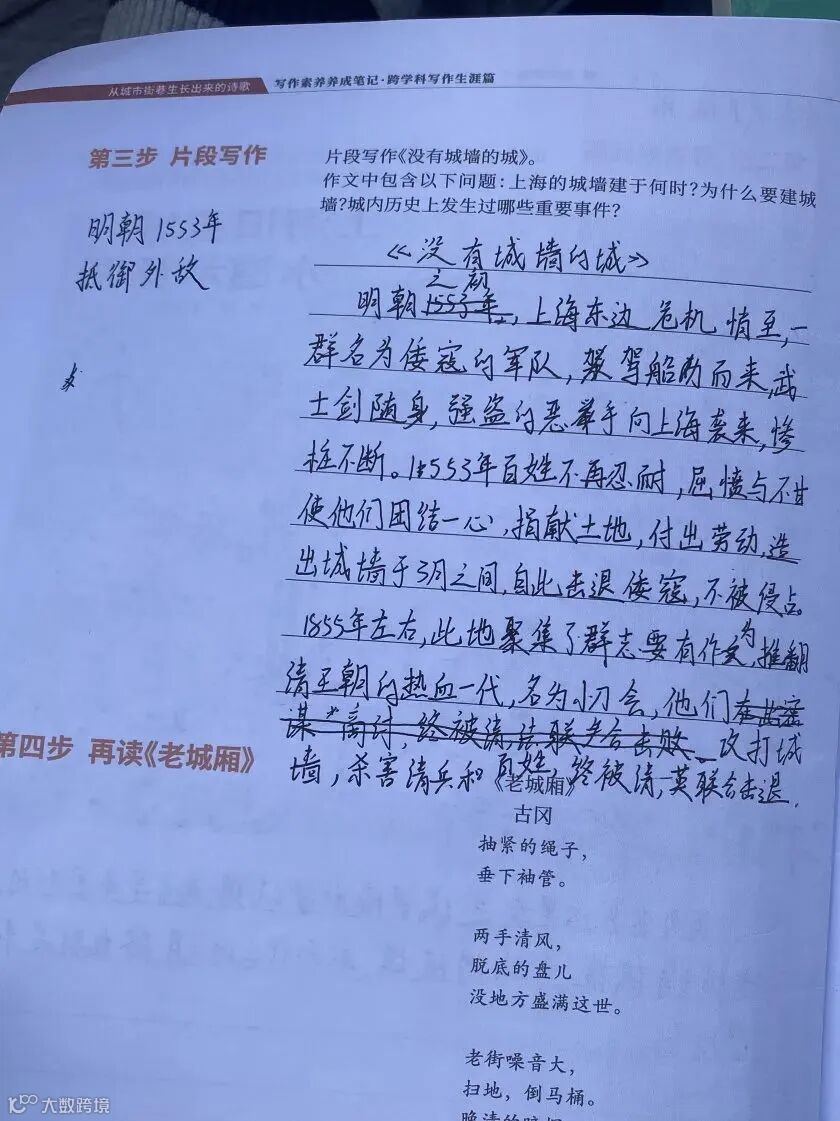 跨学科植入:运用驱动性问题推进学生学习实践,产出学习成果。利用写作帮助学生思考、提问、表达,提炼他们对知识点与真实情境的理解,在不断打磨中成为他们学习新知识的引子。