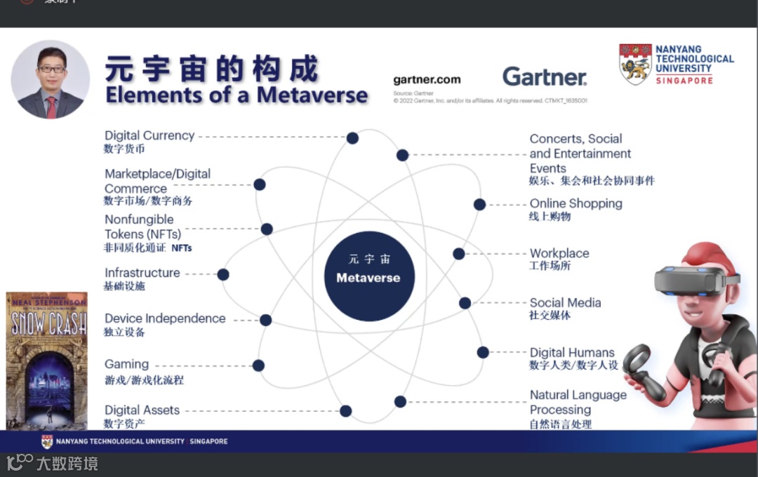 新加坡区块链协会副会长、南洋理工大学教授闫黎就“元宇宙中的设计思维和商业模式创新”发表主题演讲。闫黎介绍了不同学者对元宇宙不同的定义,并认为未来的元宇宙,是各种子元宇宙的大集成。他提出,元宇宙存在数据隐私保护、数字帝国和数字霸权的伦理问题,因此社会治理架构要跟上科技进步。此外,闫黎特别提到区块链是元宇宙的核心技术。