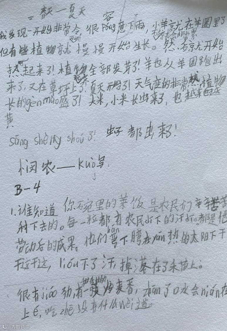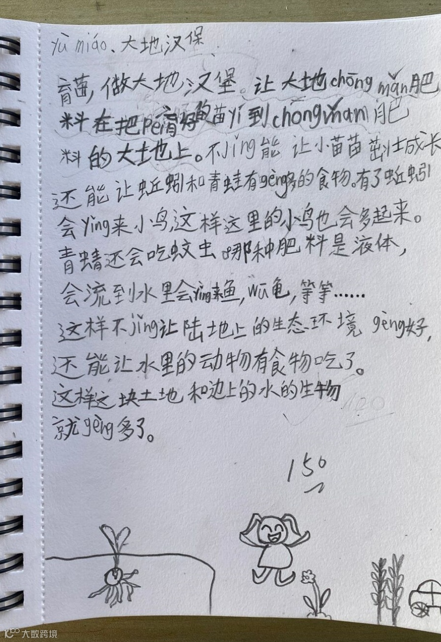 每个主题即是一堂“作文课”,围绕着主题孩子们去课堂中收获素材。在老师引导下细致观察作物的形态、颜色与生长变化,记录昆虫的轨迹、鸟鸣的节奏、风的气息、生命的轮回……大自然成为他们最丰富的词句宝库。在老师的指导下,学习思考、锤炼语言,运用贴切的词语,进行叙述和表达。