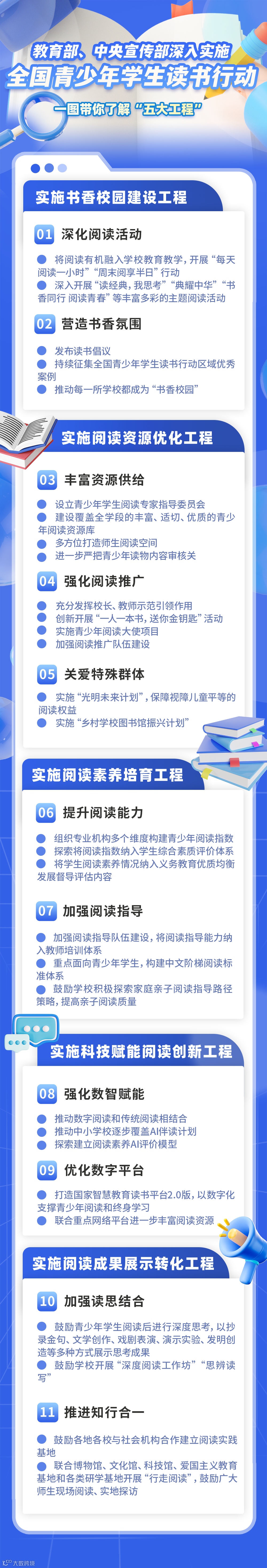 《通知》提出,在青少年学生读书行动已有工作基础上,创新实施五大工程。实施书香校园建设工程。将阅读有机融入学校教育教学,倡导分学段阅读目标,开展“每天阅读一小时”“周末阅享半日”行动,营造浓厚书香氛围。实施阅读资源优化工程。丰富资源供给,强化阅读推广,开展“一人一本书,送你金钥匙”活动。关爱特殊群体,实施“光明未来计划”和“乡村学校图书馆振兴计划”。实施阅读素养培育工程。研制青少年阅读指数,加强阅读指导队伍建设,探索家庭亲子阅读指导路径策略。实施科技赋能阅读创新工程。强化数智赋能,推动数字阅读和传统阅读相结合,开发“AI阅读助手”,推动中小学校逐步覆盖“AI伴读计划”,打造国家智慧教育读书平台2.0版,以数字化支撑青少年阅读和终身学习。实施阅读成果展示转化工程。鼓励青少年学生阅读后进行深度思考,开展“行走阅读”,做到读思结合,知行合一。