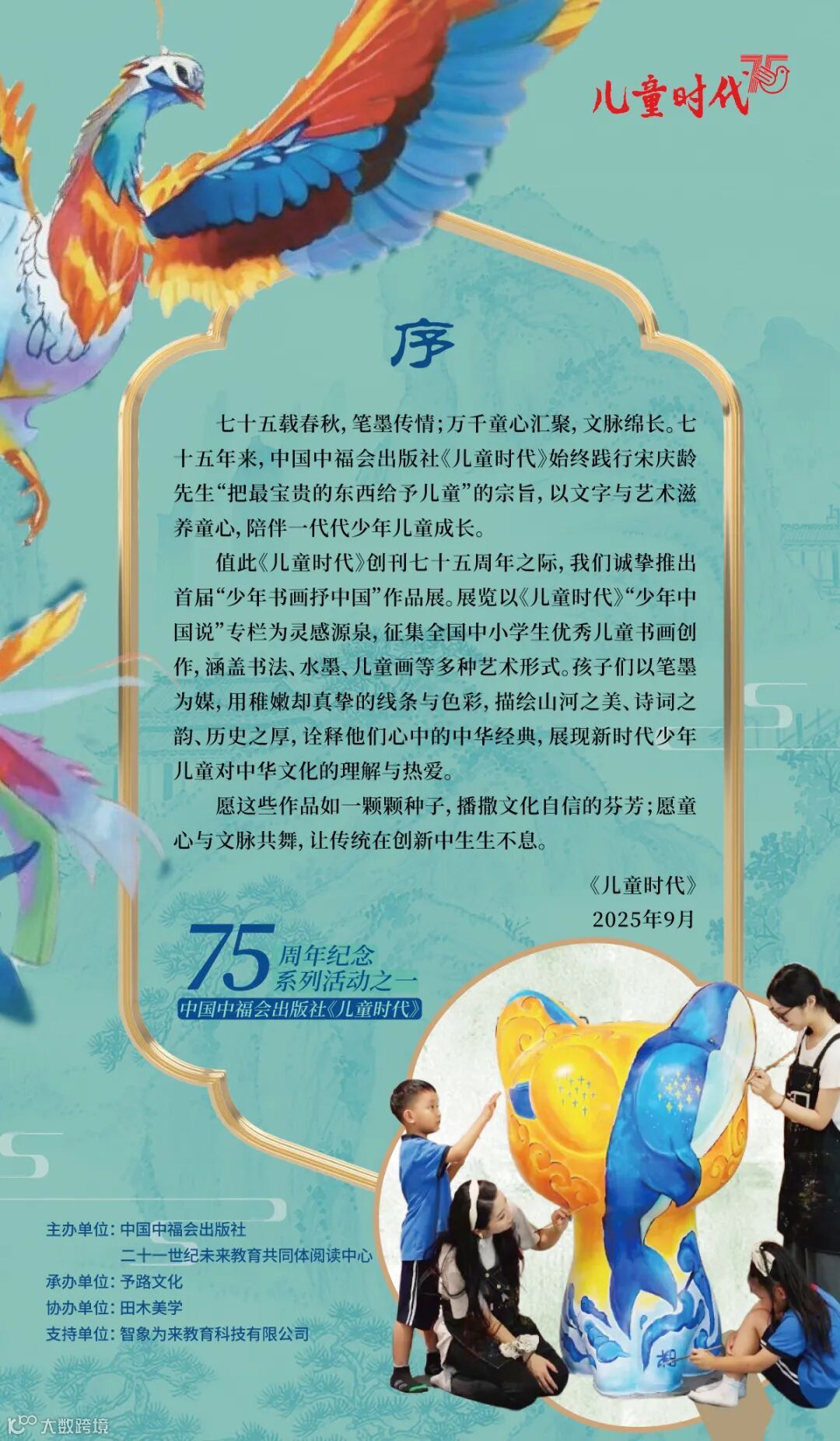 秋高气爽,翰墨飘香。9月28日下午,在祖国七十六周年华诞即将到来之际,由中国中福会出版社《儿童时代》精心策划的“少年书画抒中国”儿童书画作品展,于人文气息浓郁的上海宋庆龄文化空间隆重开幕。孩子们以书画为语,为祖国母亲献上了一份充满童真与深情的生日贺礼。