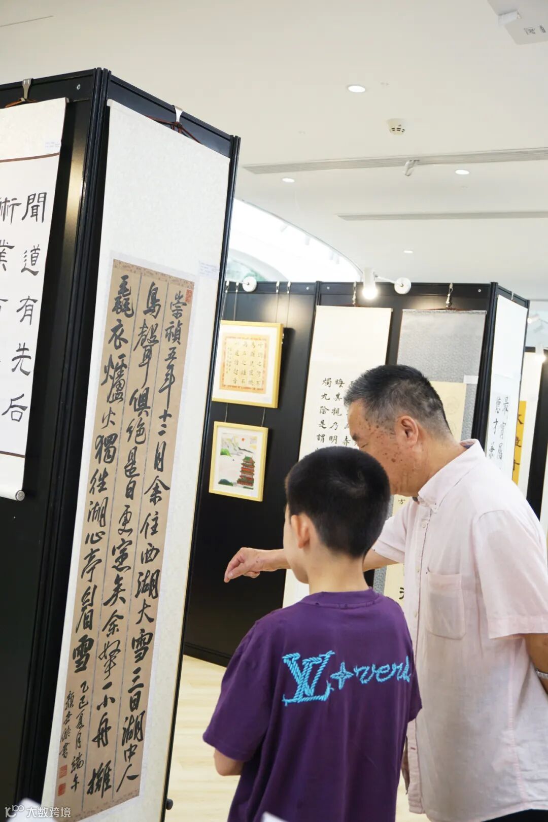 展厅内,上海文史馆馆员、大辞海美术卷主编徐建融教授与小作者亲切交谈,并对作品进行指导点评。
