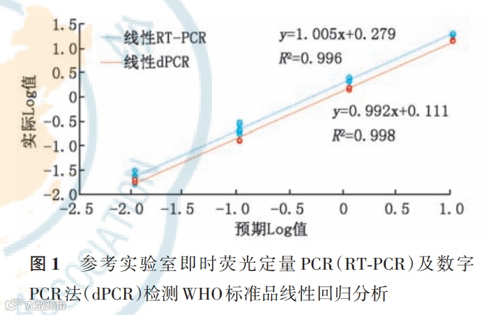 为解决这一问题,本次多中心研究首次将检测范围扩展至0.001%~0.01%(MR5.0~MR4.0),同步对比RT-PCR与dPCR的检测性能,并通过转换因子(CF)校准实验室间差异,确保结果可比性。结果如图1,使用RT-PCR法计算出的CF 值为0.53;使用dPCR方法计算CF值为0.77。确认阶段RT-PCR及dPCR法的CF值均可用。