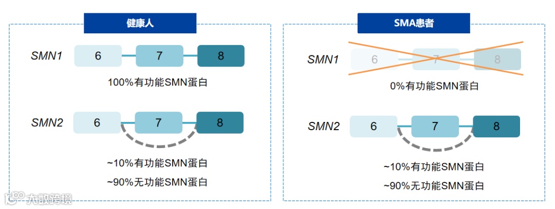 对于SMA患者的诊断主要依靠检测其体内SMN1基因是否缺失,若该基因缺失,则患病;SMN2是SMN1的备份基因,两者几乎完全相同,在SMN1基因缺失时,SMN2的拷贝数量关系到SMA疾病的严重程度,一定程度上指导用药及预后。亦有更多国内外专家学者对SMN2功能进行研究。