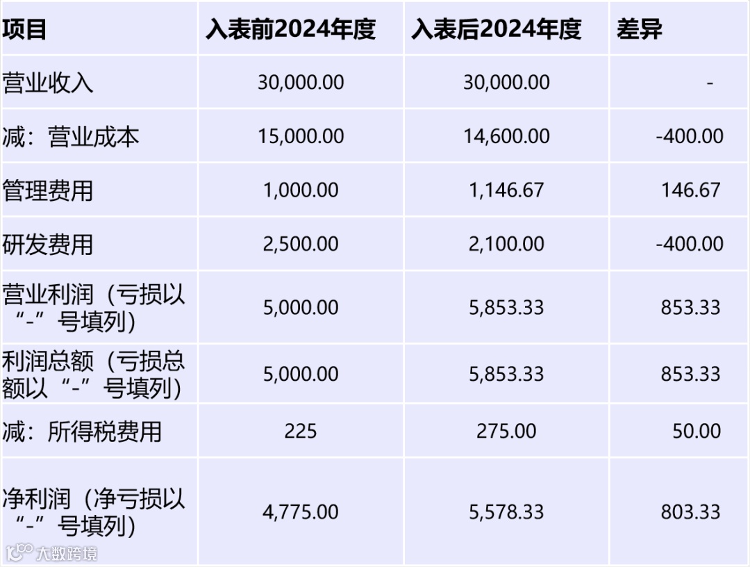 企业A是一家制造型企业,该企业自2024年1月1日开始执行《暂行规定》,并采用未来适用法模拟财务报表,期限是2024年1月1日至2024年12月31日。企业A是高新技术企业,所得税税率为15%,研发费用满足加计扣除的条件。