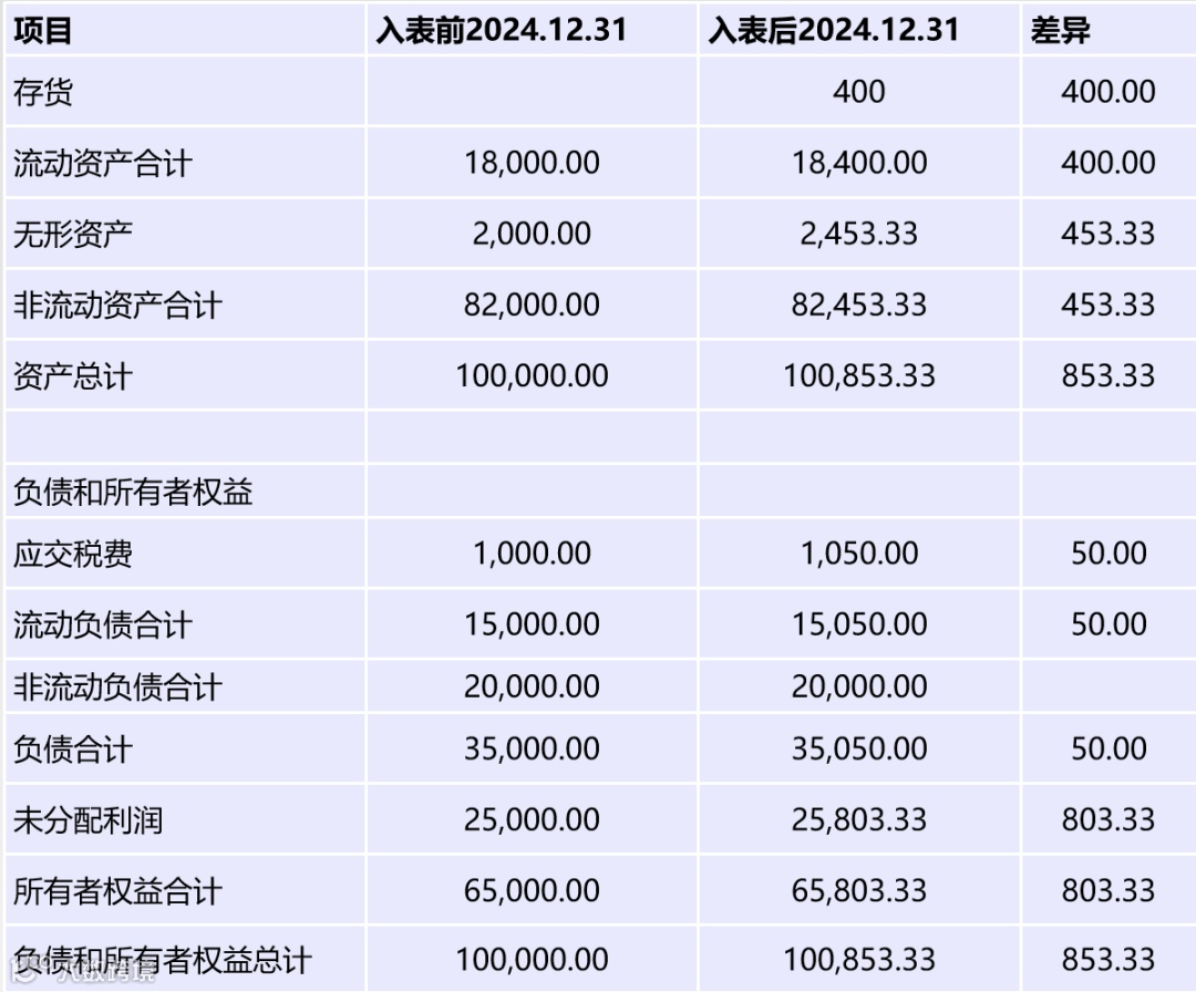 入表前,企业A是以费用化的方式处理与数据资产相关的支出;入表后,企业A将满足资产确认条件的支出予以资本化,可以从表中看到,资产总计增加853.33万元,因入表调整导致企业未分配利润显著上升,增加803.33万元。