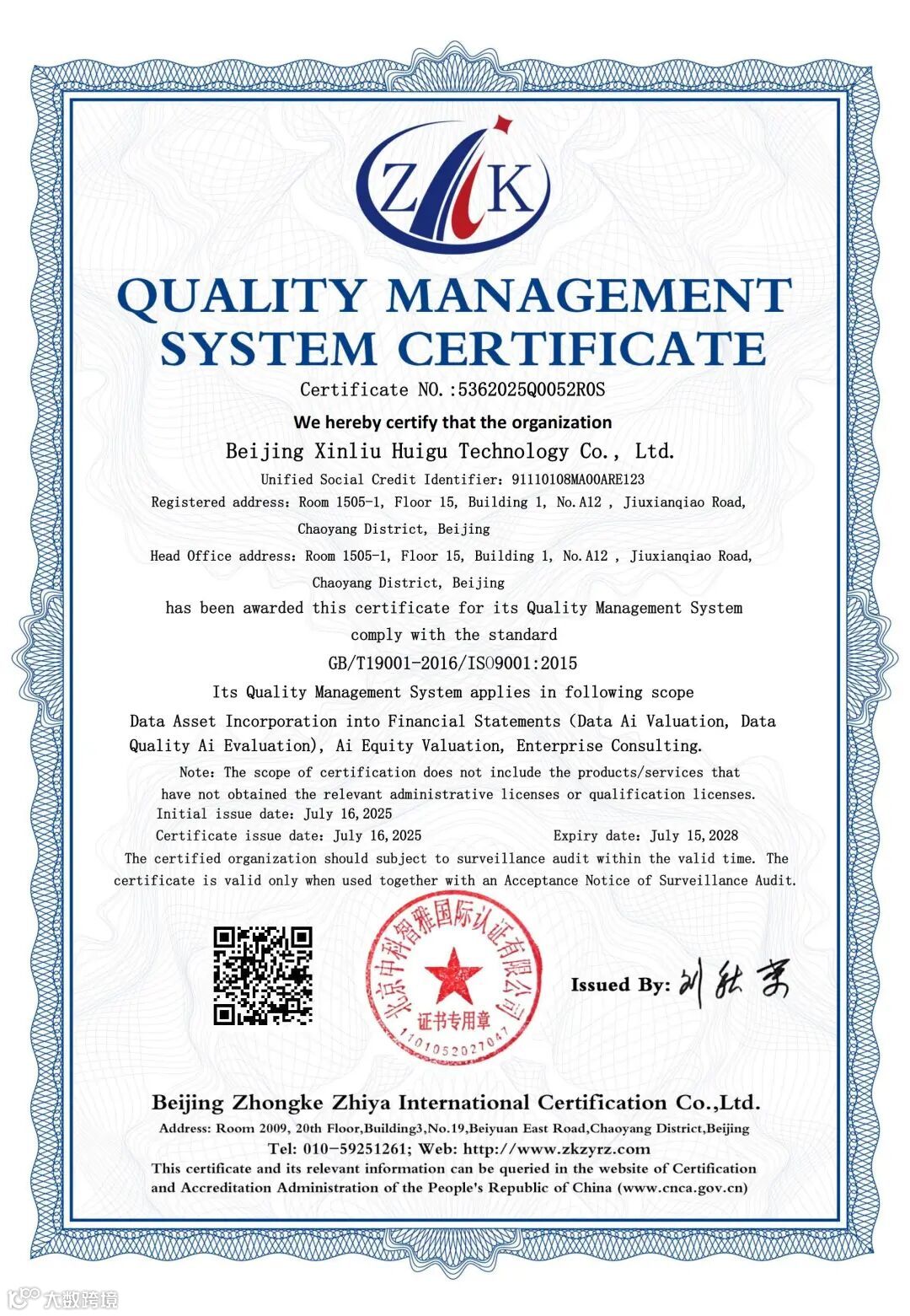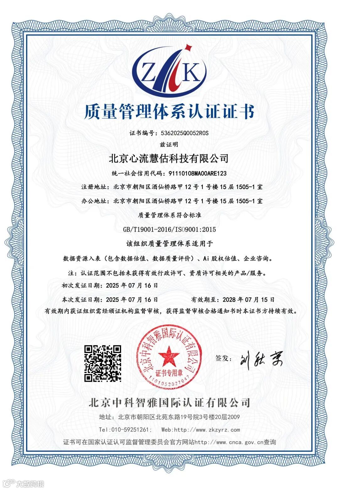 近日,北京心流慧估科技有限公司(以下简称“心流慧估”)正式通过北京中科智雅国际认证有限公司的严格审核,成功获得ISO9001:2015质量管理体系认证证书(证书编号:5362025Q0052R0S)。这标志着心流慧估在数据资源入表(含数据估值、数据质量评价)、Ai股权估值、企业咨询等业务领域的质量管理体系已达到国际标准化水平,进一步夯实了公司在数据智能服务领域的专业性与可靠性。