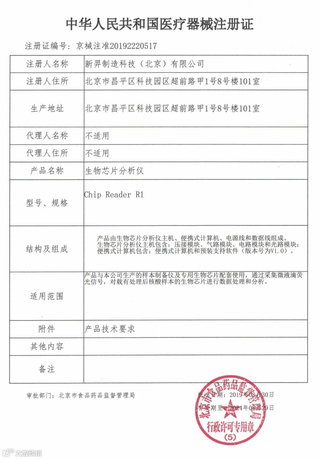 近日,经北京市食品药品监督管理局审批,新羿生物数字PCR系统的生物芯片分析仪获医疗器械注册批文,注册证编号:京械注准 20192220517。