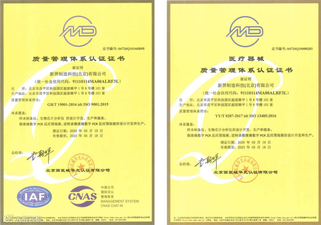 2020年5月, 新羿生物全资子公司新羿制造科技(北京)有限公司已顺利通过ISO13485和ISO9001质量管理体系认证,并荣获认证证书。