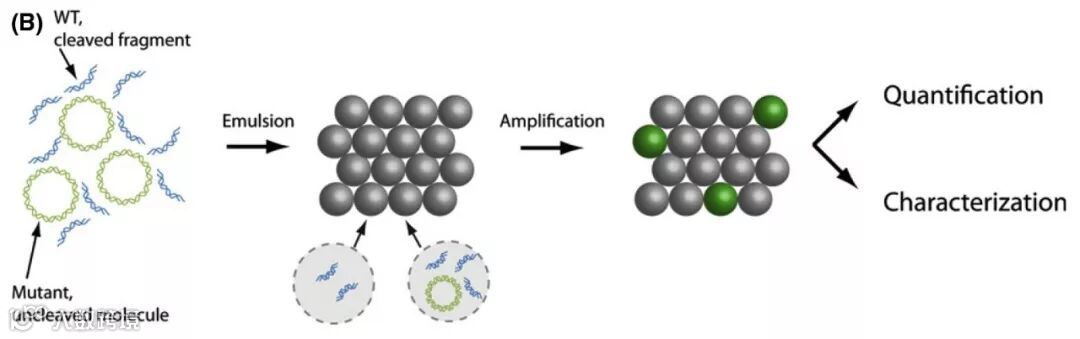 Taylor3建立了Digital Deletion Detection(3D)检测方法,通过微液滴数字PCR技术最低可对10-8频率的线粒体DNA突变进行检测。该方法在PCR扩增后将微液滴打破进行测序分析。数字PCR使目标模板在微液滴中进行均一的扩增,提高了对稀有分子的捕获效率。