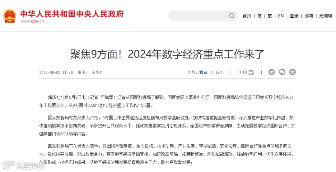 国家发展改革委办公厅、国家数据局综合司印发的《数字经济2024年工作要点》明确了九大重点工作方向,旨在推动我国数字经济迈向更高水平: