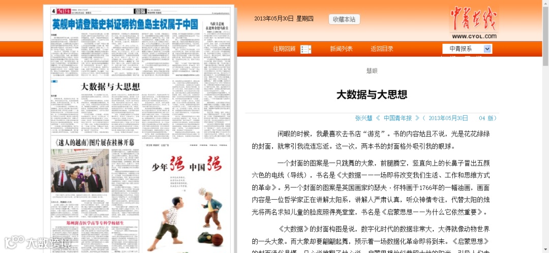 2013年5月,我曾在《中国青年报》发表一篇评论,题目是《大数据与大思想》。当时,大数据概念刚刚兴起,人们轰轰烈烈地在大数据如何如何大的“大”字上做文章。