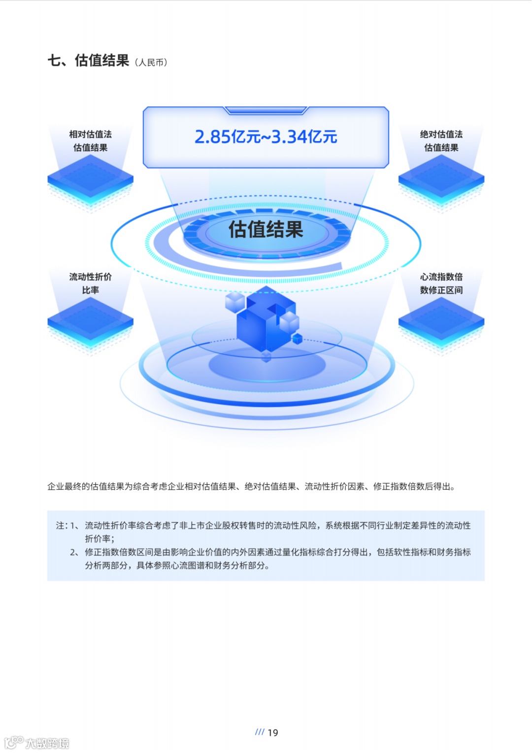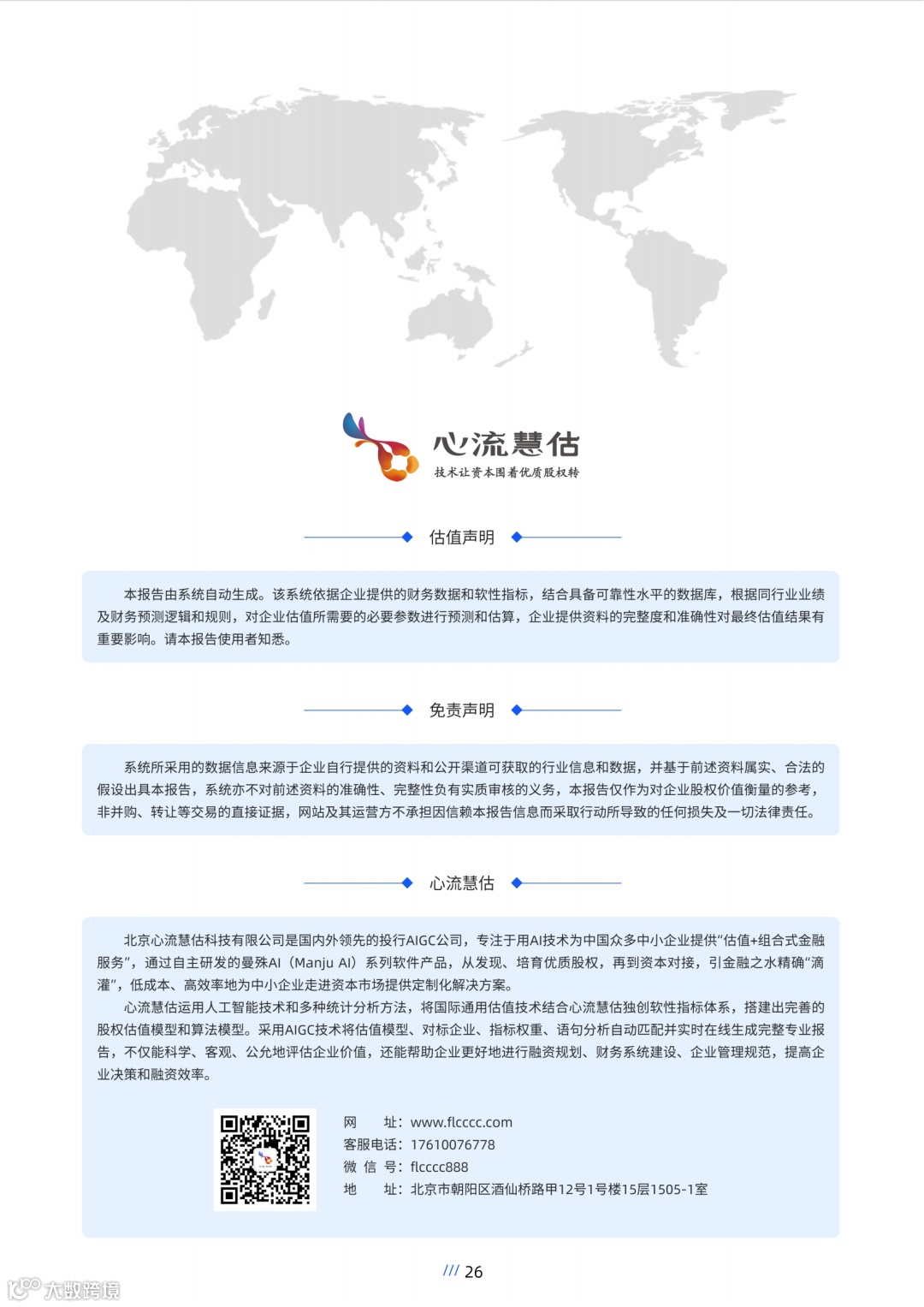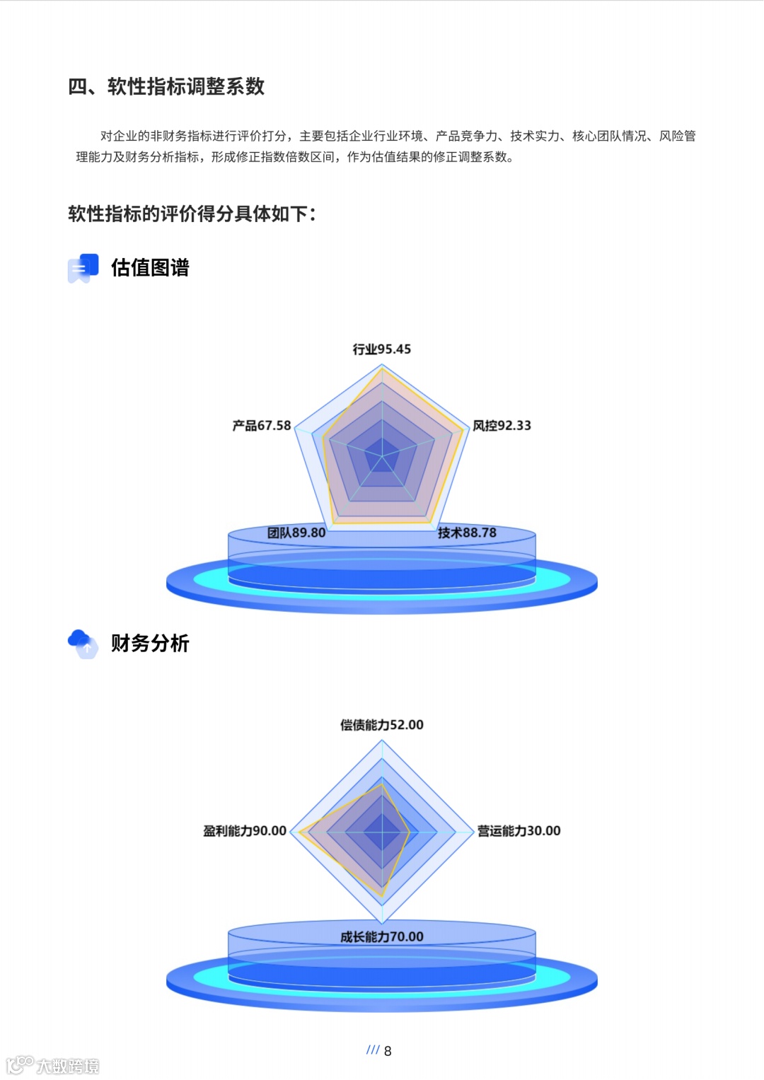 全新升级的估值报告,在保留科学严谨的基础上,更加注重估值结果的合理性和报告的完整性。通过AI技术与统计分析的深度融合,结合国际通用估值方法与心流慧估独创的软性指标体系,我们的估值更加贴近企业真实价值,为企业发展提供精准导航。