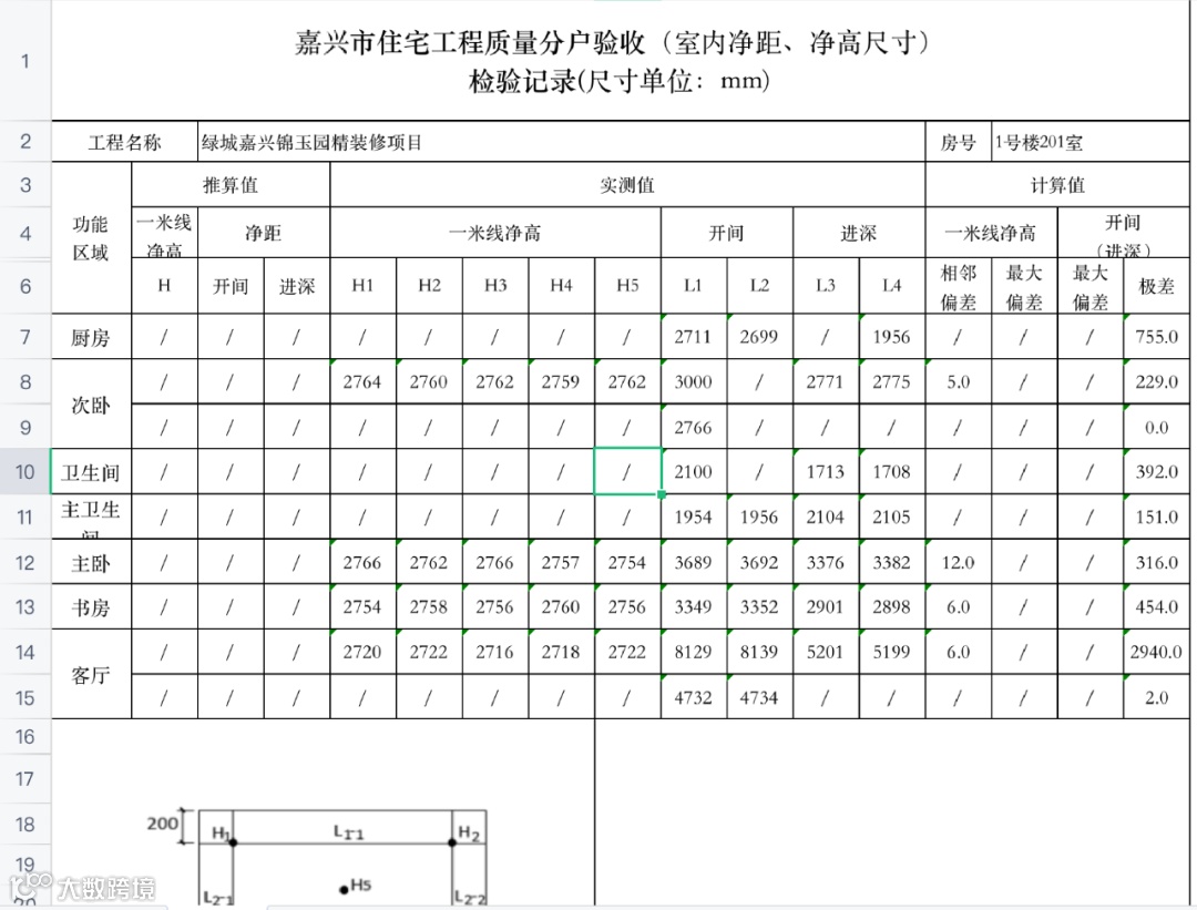 涉及地面、墙面、天花板、门窗等多个区域和装修项目,数据量庞大,需逐项准确测量。