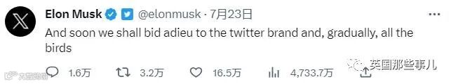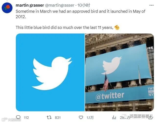 在今天Twitter正式更名之后,他也发文跟这只蓝色的小鸟道别: