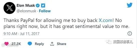 2017年,马斯克特地从PayPal手里买回了X.com这个域名,为此,他还发Twitter庆祝: