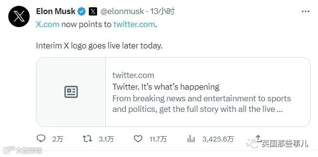 马斯克宣布,在新(临时)Logo投入使用的同时,Twitter网址也由twitter.com迁移到了X.com。