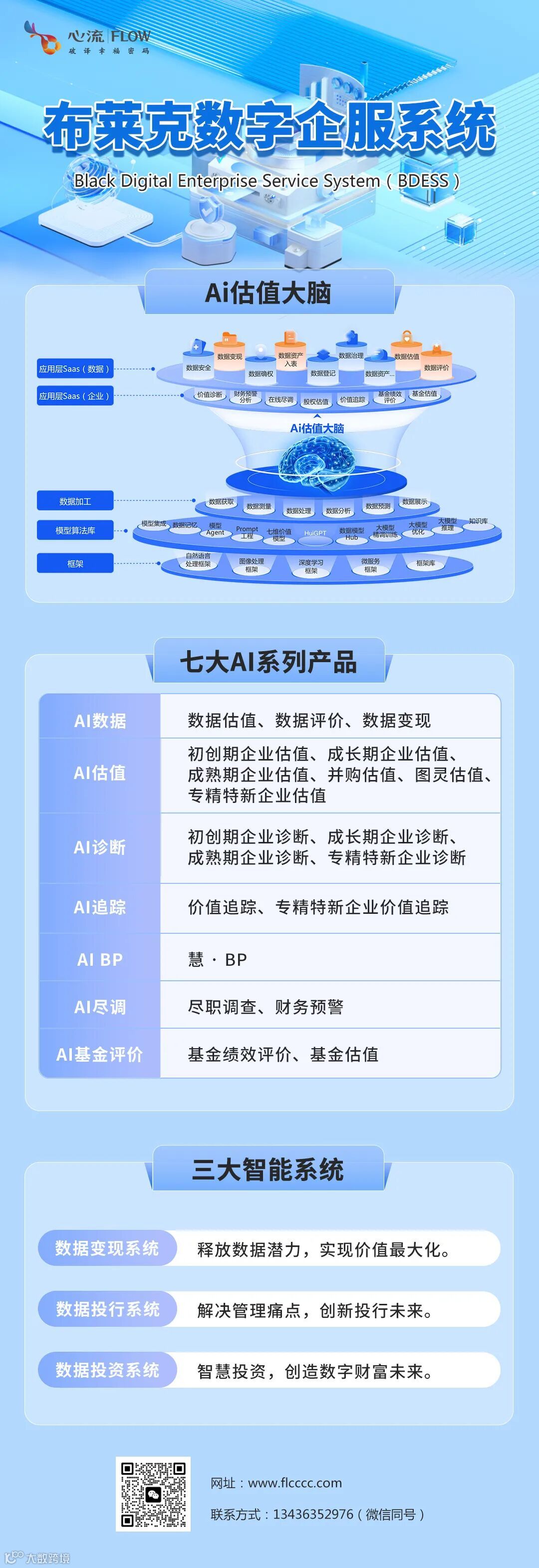 心流FLOW 北京心流慧估是国内外领先的投行AIGC公司,专注用Ai为中国中小企业提供“估值+组合式金融服务”。通过自主研发的布莱克数智投融资系统(BAiFS),从股权发现、培育到资本对接,为中小企业进入资本市场提供高效定制化解决方案。