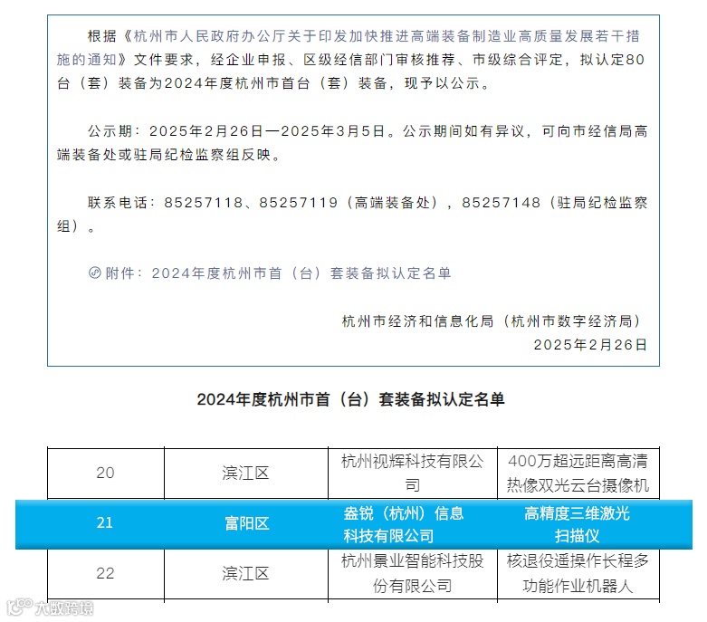 近日,杭州市人民政府办公厅公示2024年度首台(套)装备认定名单,盎锐(杭州)信息科技有限公司自主研发的高精度三维激光扫描仪凭借其核心技术突破与国产化创新优势成功入选。此次评选经严格的企业申报、区级审核及市级综合评定,全市仅80台(套)装备获此殊荣。在国资委79号文件全面推进国央企信创国产化替代的政策背景下,盎锐科技的产品入选标志着我国高端装备自主化进程再添重要成果,为国产化替代战略提供关键技术支撑。